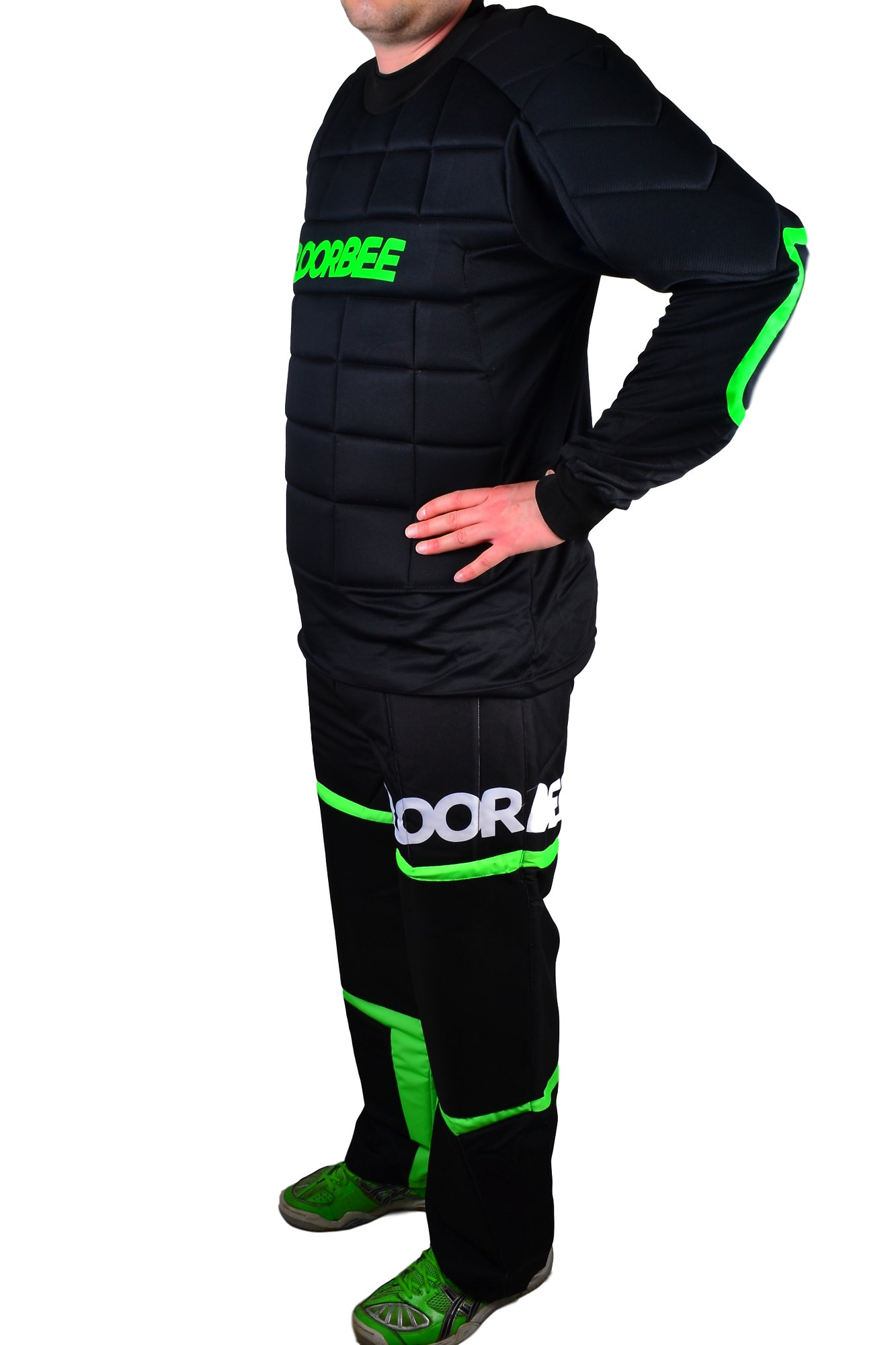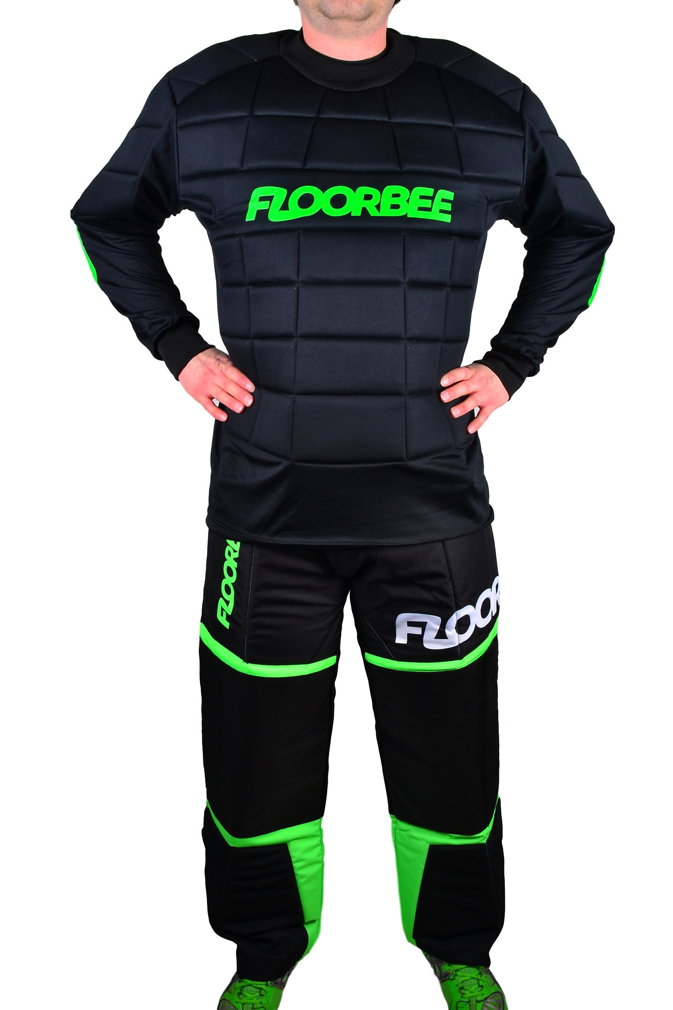 FLOORBEE Goalie Armor jsou kvalitní a velmi odolné profesionální brankářské kalhoty připravené na nejtěžší zápasy a tréninky. Jsou pevně prošívané, což zvyšuje jejich výdrž a životnost. Opticky brankáře zvětšují, přitom jsou pohodlné a zároveň komfortní při chytání. Kalhoty mají elastický pas - zapínání kalhot v oblasti pasu na suchý zip i řemen. Kalhoty mají na kolenou a v oblasti kyčlí skvělé polstrovaní z vysoce kvalitního oděruvzdorného materiálu Cordura, který zajišťuje delší životnost kalhot.